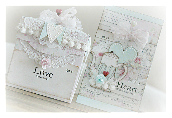 Here you can see that I've mixed in some vintage lace, a paper doily and a shabby rose...Items I've had in my stash for a while now. That is what I love so much about shabby design. It is so easy to incorporate all the little 'misfits' you might have...They only add to the charm of your creations :)