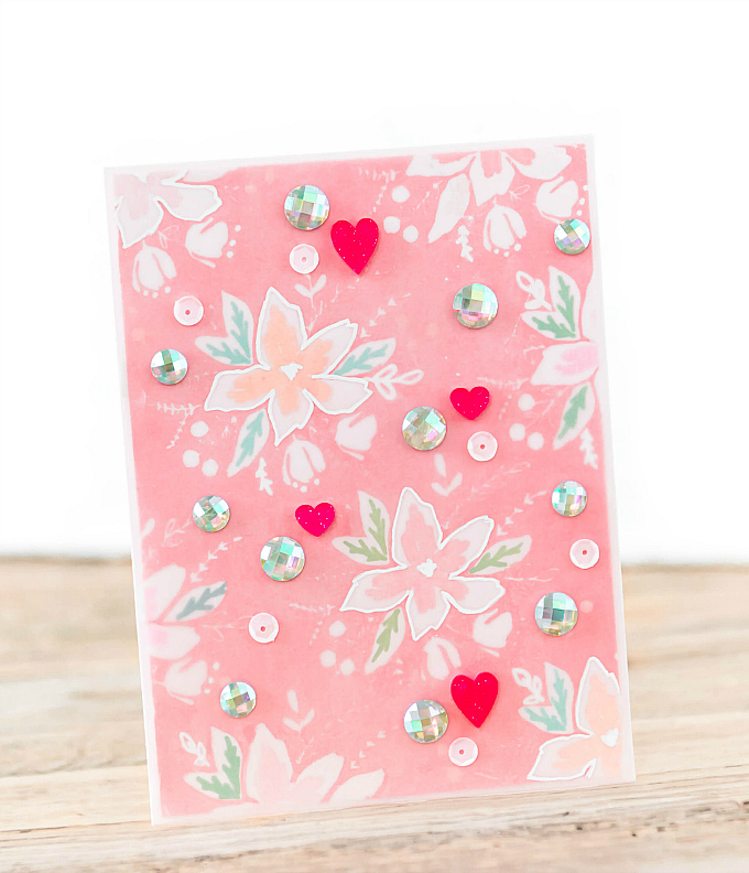 I followed all the same steps, but instead of adding all the colorful fonts, I used a vellum overlay, and adorned the card with rhinestones, sparkly epoxy hearts, sequins, and some white pen outlines.